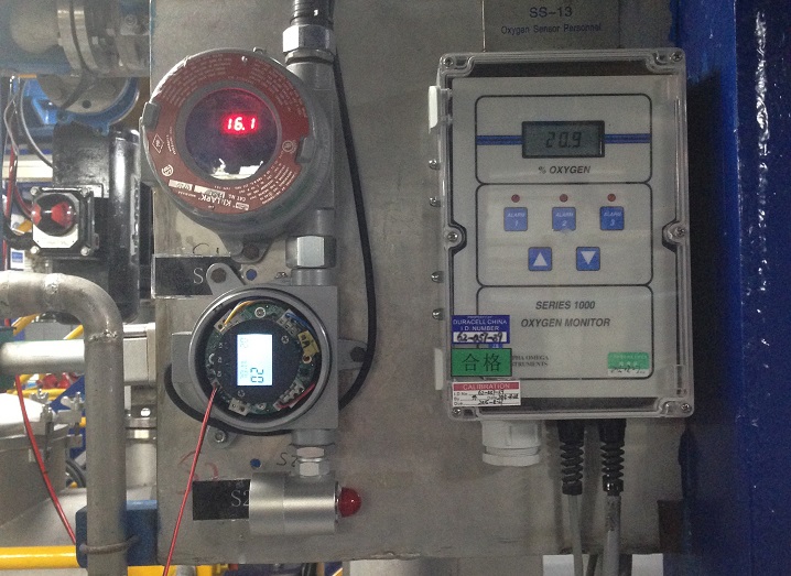 工業(yè)氧氣檢測儀,正在調試,加料前先抽真空,抽真空后加入純氮氣吹掃罐內,充滿純氮,不允許有氧氣存在,整個都在密封環(huán)境下操作,對儀表的耐壓能力要求非常高,沃賽特公司的工業(yè)型氧氣檢測儀,能夠在18次/天抽真空狀態(tài)下,依然保持精準的檢測性。