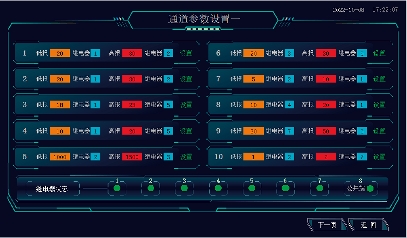 本界面展示各個通道設(shè)置的低報、高報報警值及對應(yīng)關(guān)聯(lián)的繼電器編號,如需更改,點擊“設(shè)置”進行更改