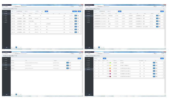 實(shí)時(shí)數(shù)據(jù)是根據(jù)網(wǎng)格化標(biāo)準(zhǔn)對(duì)設(shè)備進(jìn)行分組查看,可直觀展示在不同監(jiān)測(cè)參數(shù)時(shí)的所有點(diǎn)位布設(shè)監(jiān)測(cè)總覽圖及設(shè)備在地圖上的位置,并通過(guò)顏色的變化展示設(shè)備狀態(tài),并能根據(jù)等級(jí)圖例直觀觀察污染的程度,查看各參數(shù)實(shí)時(shí)曲線變化圖;報(bào)警信息模塊分為首頁(yè)報(bào)警信息提醒、單臺(tái)設(shè)備的報(bào)警信息列表和報(bào)警信息歷史查詢?nèi)糠?,通過(guò)多途徑對(duì)超標(biāo)設(shè)備信息進(jìn)行實(shí)時(shí)提醒記錄,以供后期處理和追溯;統(tǒng)計(jì)分析模塊采用云計(jì)算與數(shù)理統(tǒng)計(jì)分析相結(jié)合的方法,又細(xì)分為設(shè)備統(tǒng)計(jì)、污染排名、參數(shù)統(tǒng)計(jì)和對(duì)比統(tǒng)計(jì)四部分,主要是對(duì)區(qū)域內(nèi)設(shè)備狀態(tài)的實(shí)時(shí)統(tǒng)計(jì)、不同時(shí)間段和監(jiān)測(cè)參數(shù)的污染排名、設(shè)備各項(xiàng)參數(shù)的極值統(tǒng)計(jì)查詢、不同監(jiān)測(cè)因子的對(duì)比分析等;單臺(tái)設(shè)備展示模塊不僅展示設(shè)備的實(shí)時(shí)數(shù)據(jù)及詳細(xì)信息,并且可數(shù)圖結(jié)合,以曲線圖展示歷史數(shù)據(jù)和趨勢(shì)走向,并且曲線圖可導(dǎo)出到Excel表格中,自動(dòng)計(jì)算最大值、最小值、平均值,極大方便分析管理